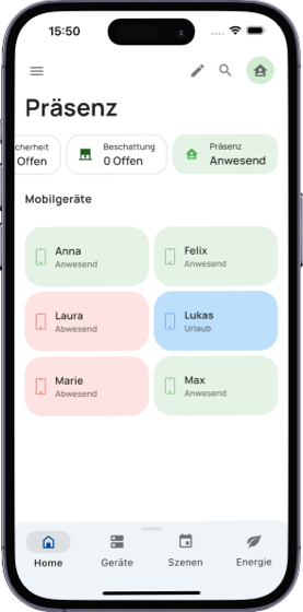 Manuelles Setzen des Anwesenheitsstatus durch SmartPhone, Tablet oder Mehrfach-Taster im Eingangsbereich.