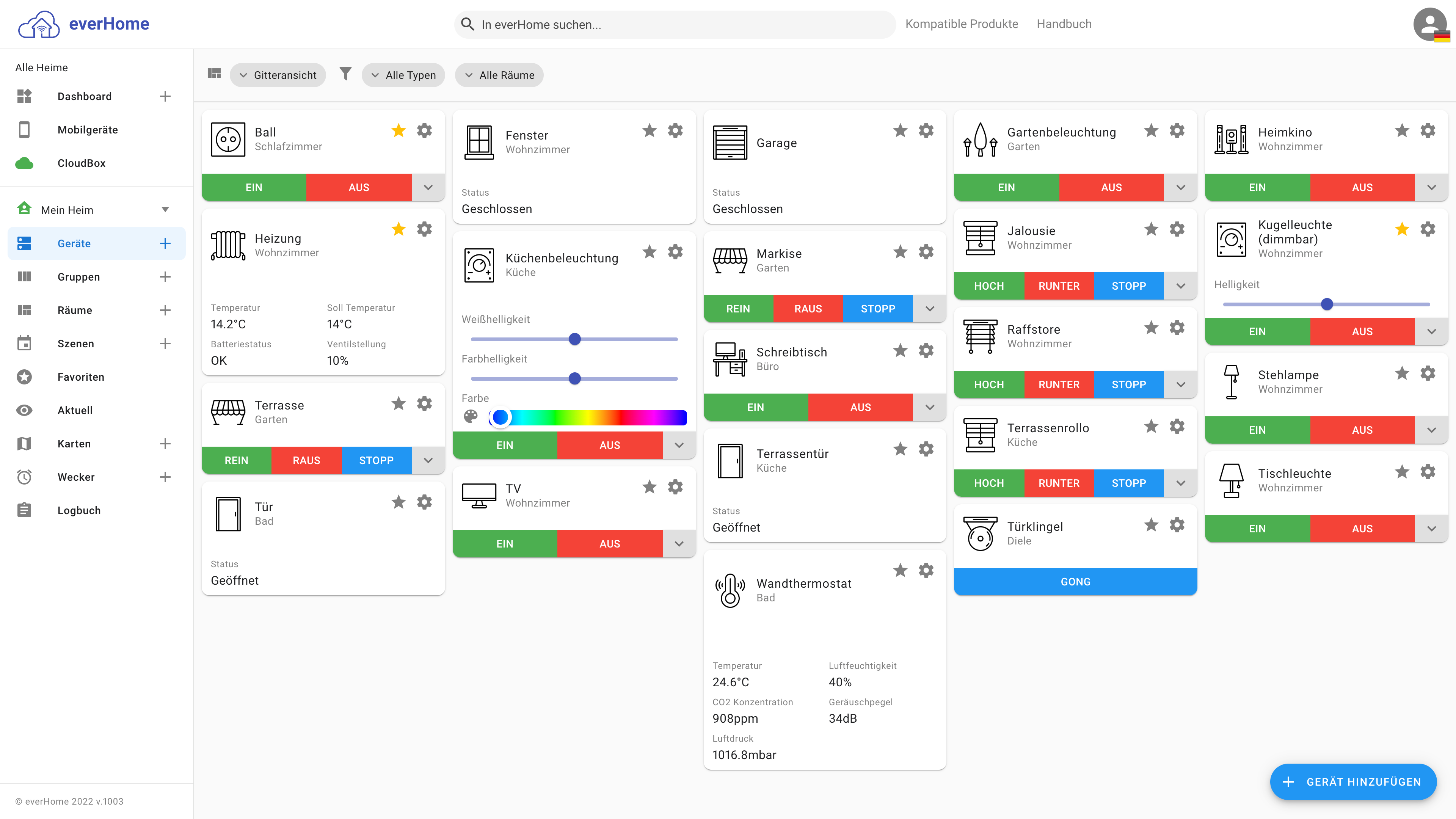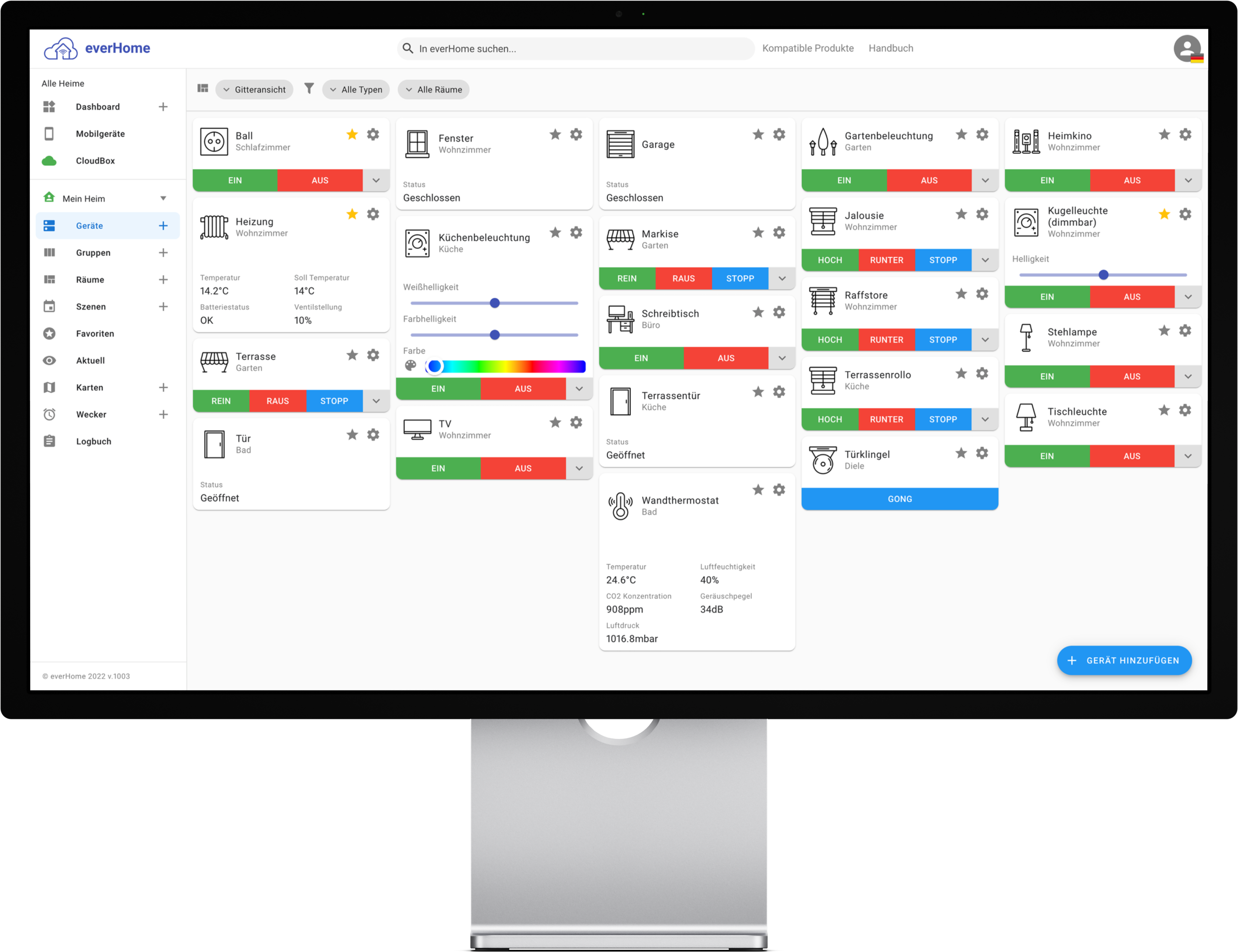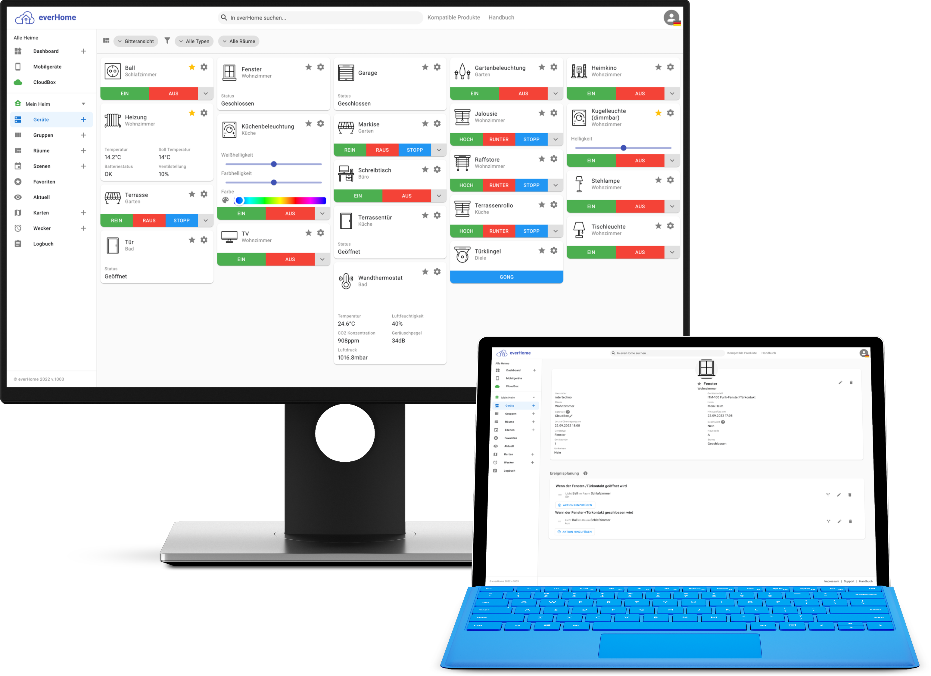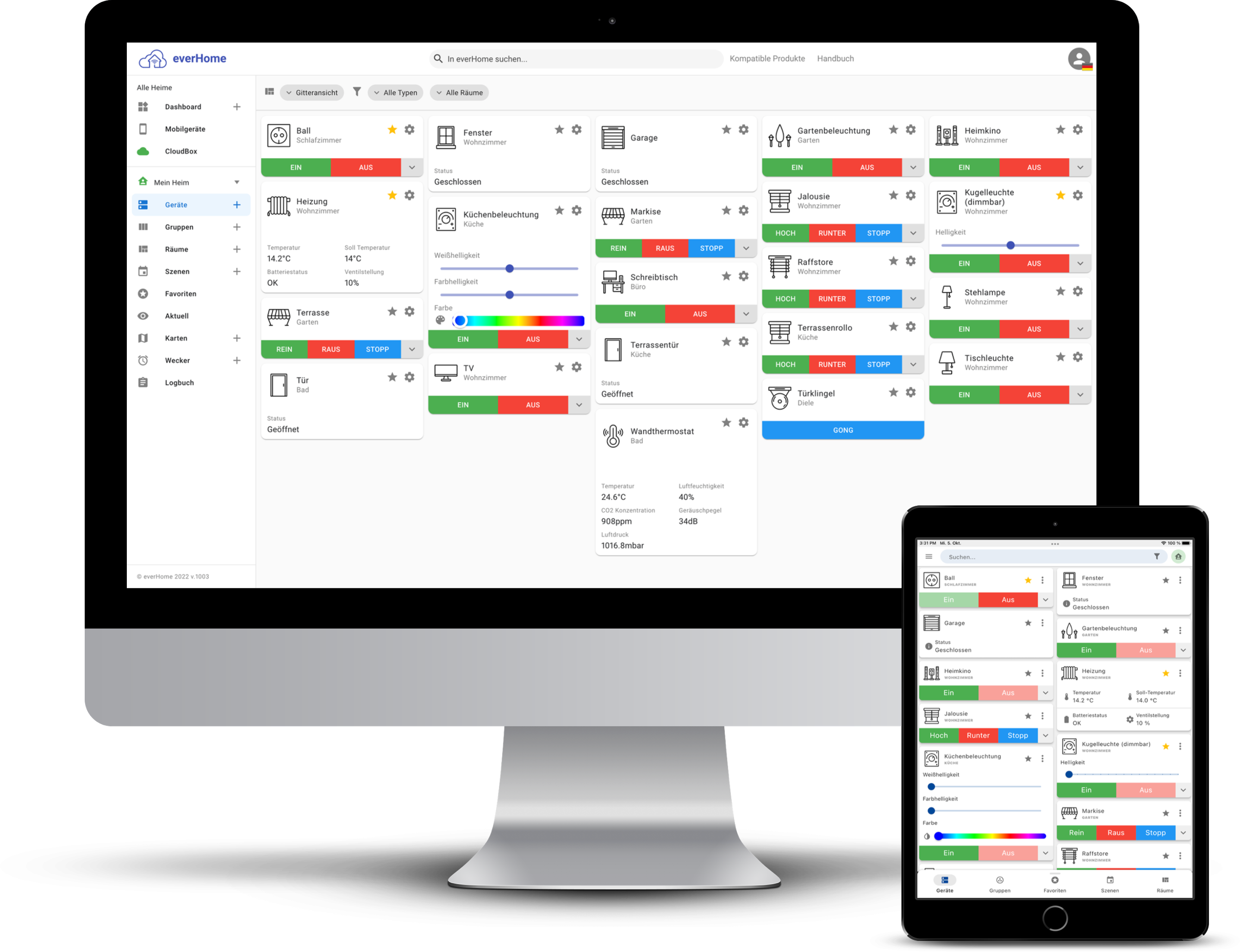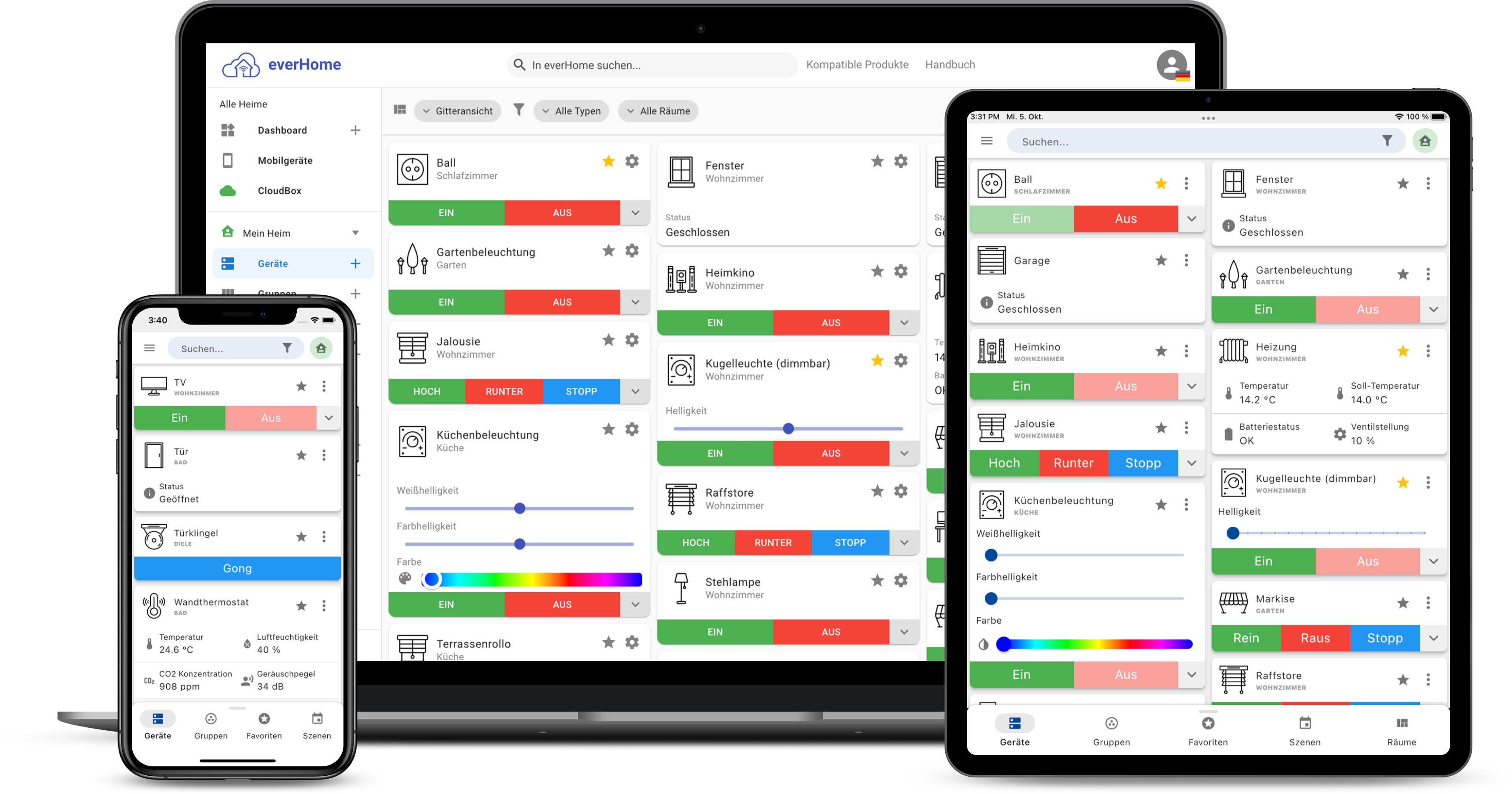 Lichtsteuerung Rollladen, Jalousien, Raffstores, Textilscreens und Markisen Heizungssteuerung Sicherheit Anwesenheitserkennung SprachsteuerungSchnellstart-Anleitungen der everHome Produkte