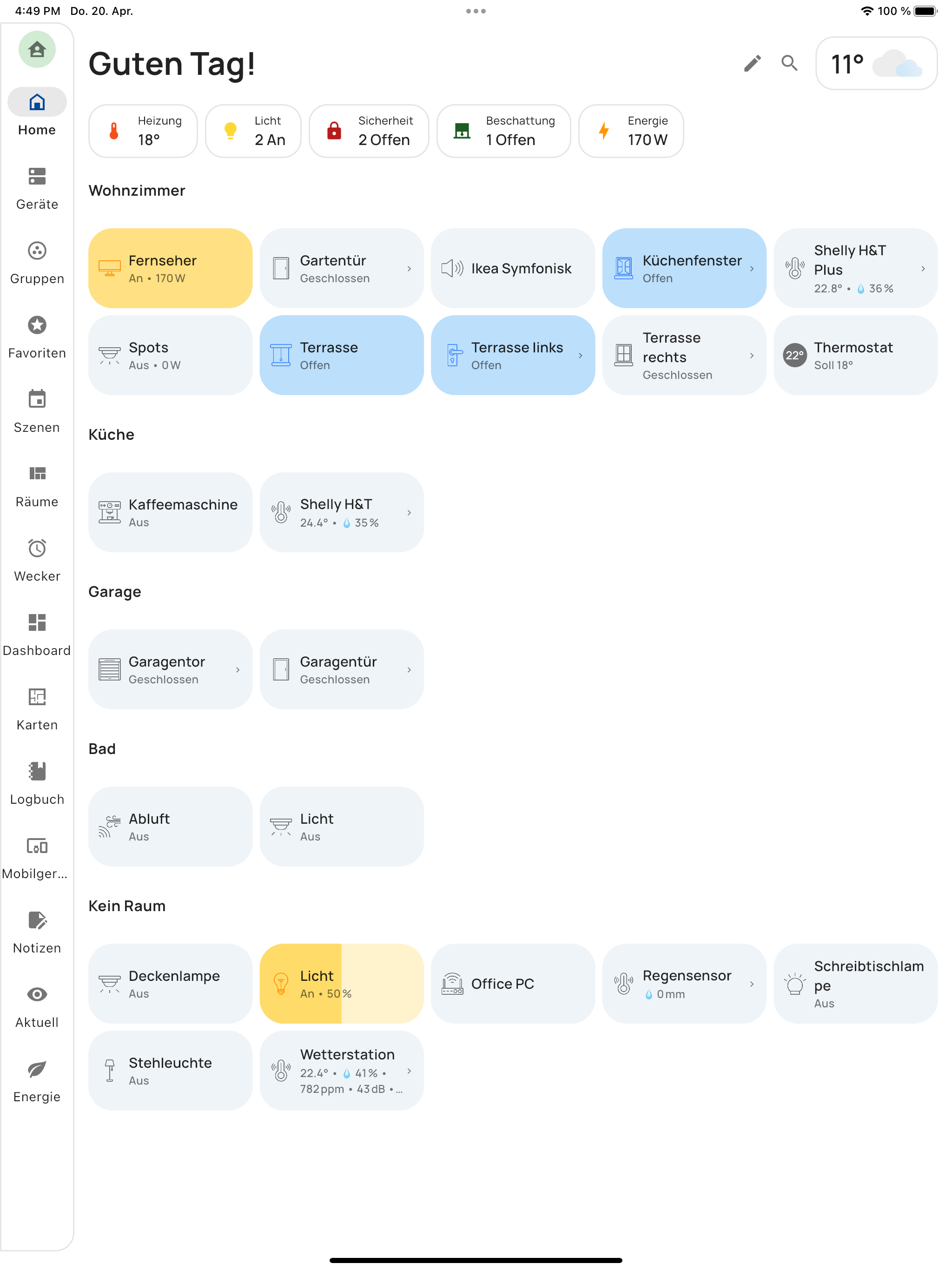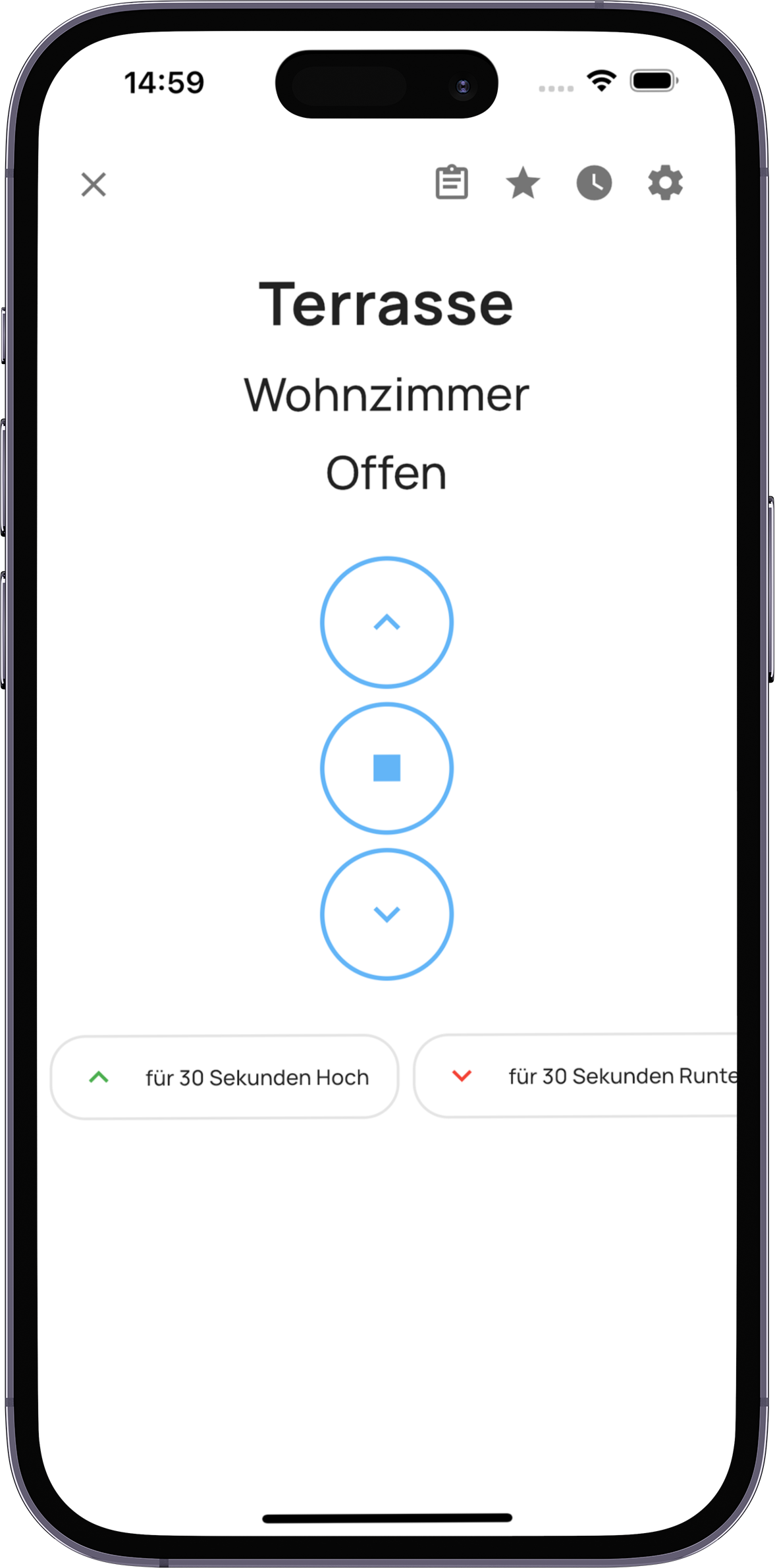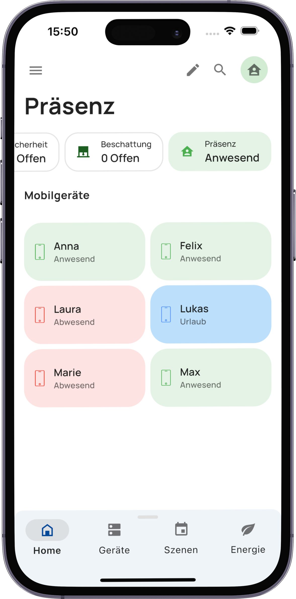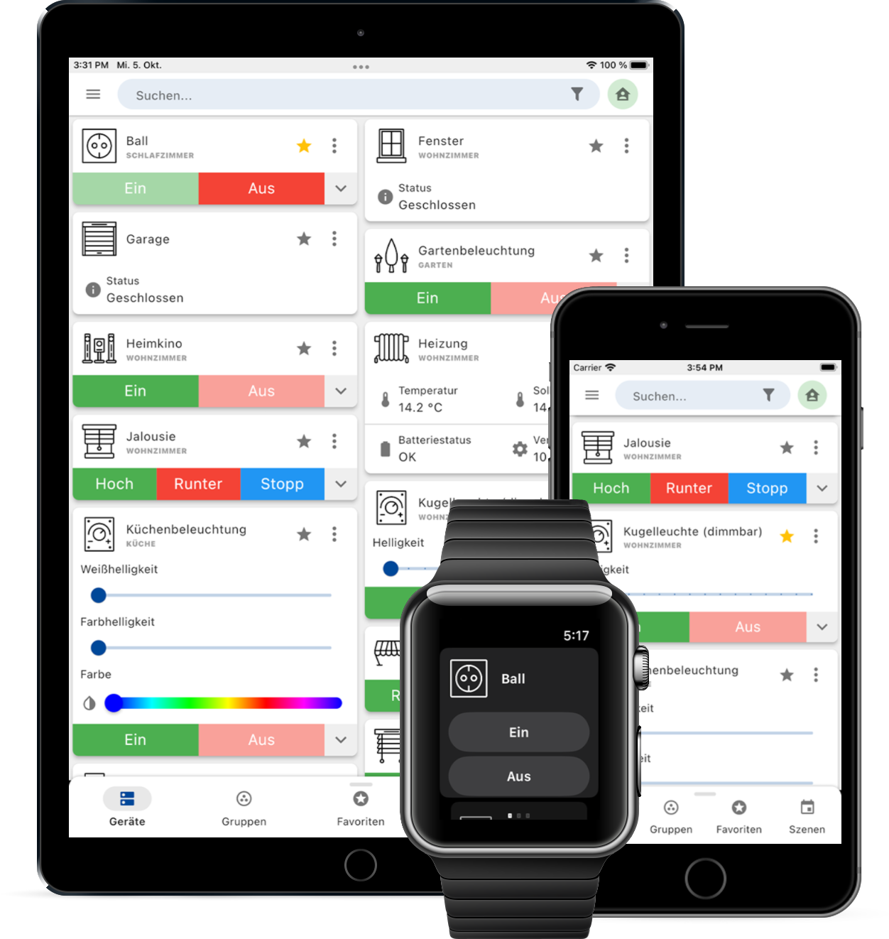 Smartphone Smartphone Smartphone, Tablet, Laptop Tablet, iMac Tablet, Monitor Smartphone, Tablet, Watch Tablet Tablet Tablet Tablet Tablet Tablet Lichtsteuerung Rollladen, Jalousien, Raffstores, Textilscreens und Markisen Heizungssteuerung Sicherheit Anwesenheitserkennung Lichtsteuerung Rollladen, Jalousien, Raffstores, Textilscreens und Markisen Heizungssteuerung Sicherheit AnwesenheitserkennungInformationen zu den einzelnen Funktionsbereichen