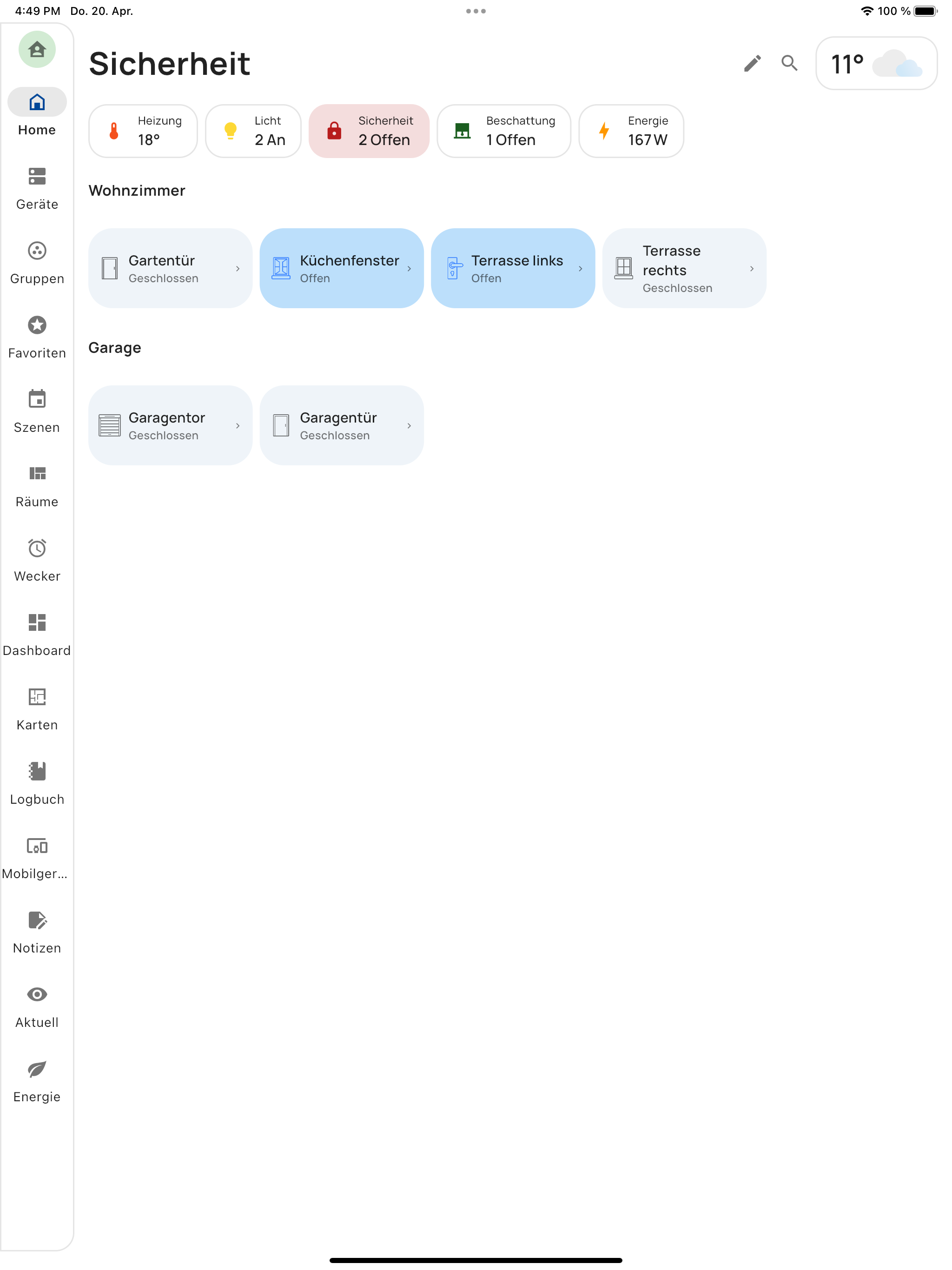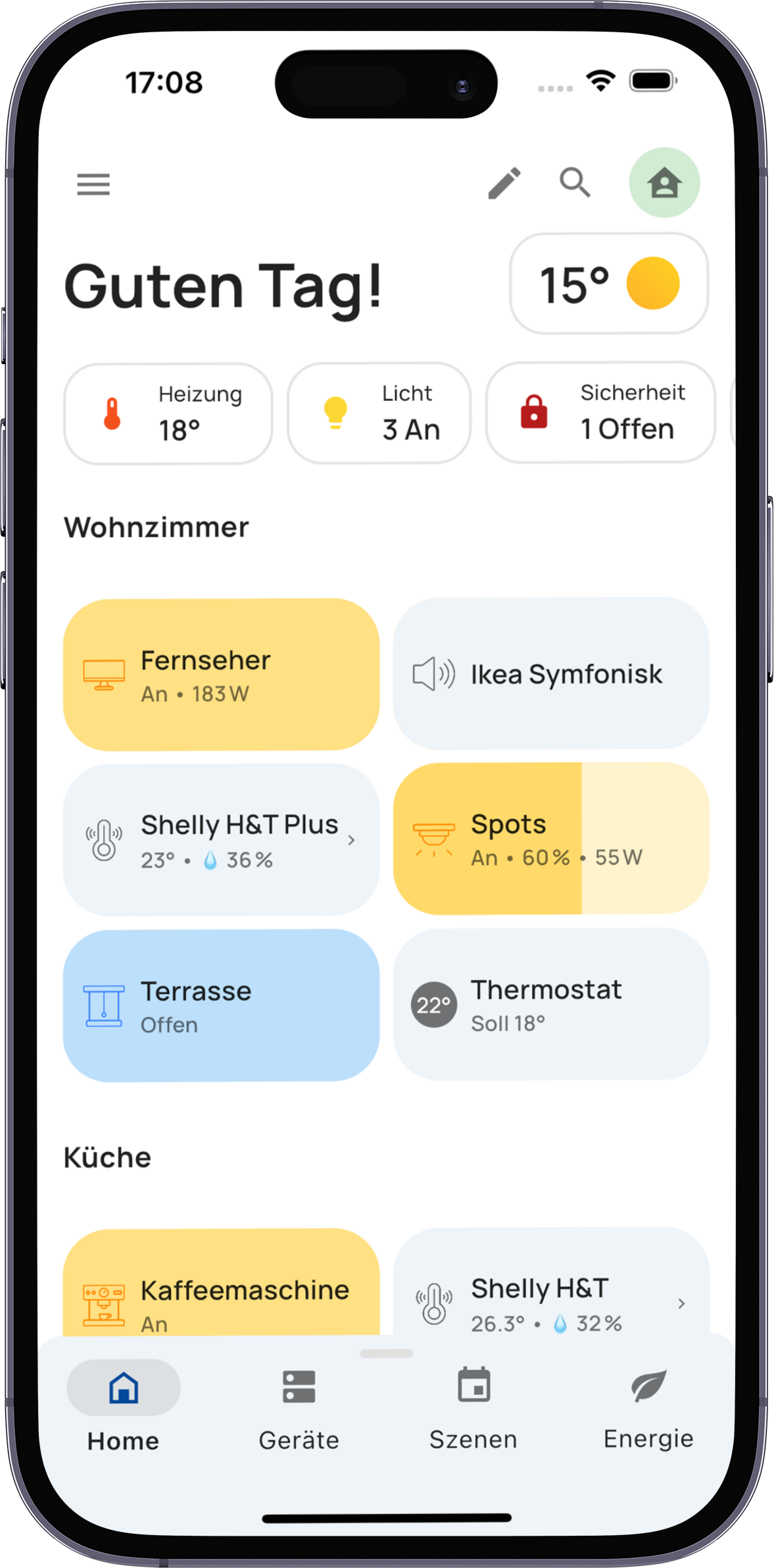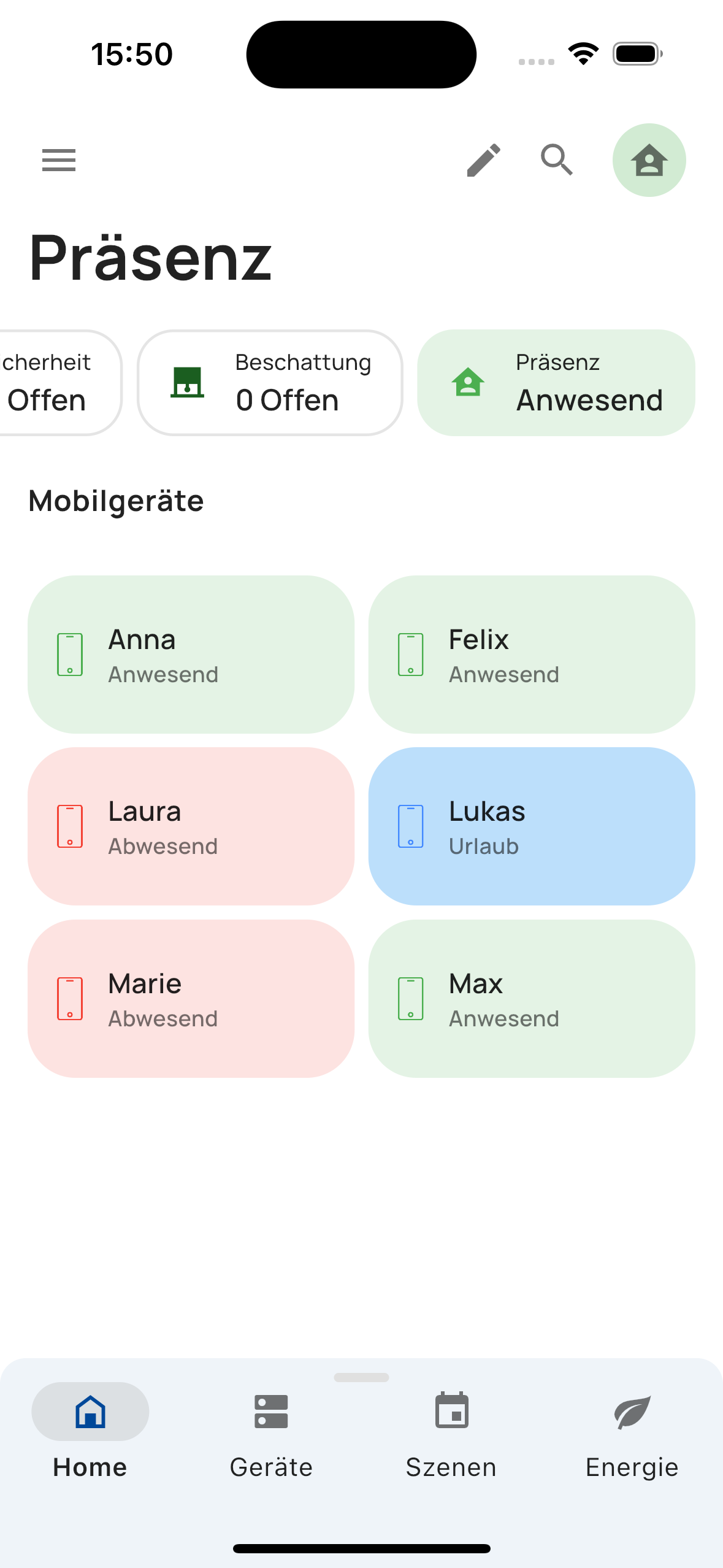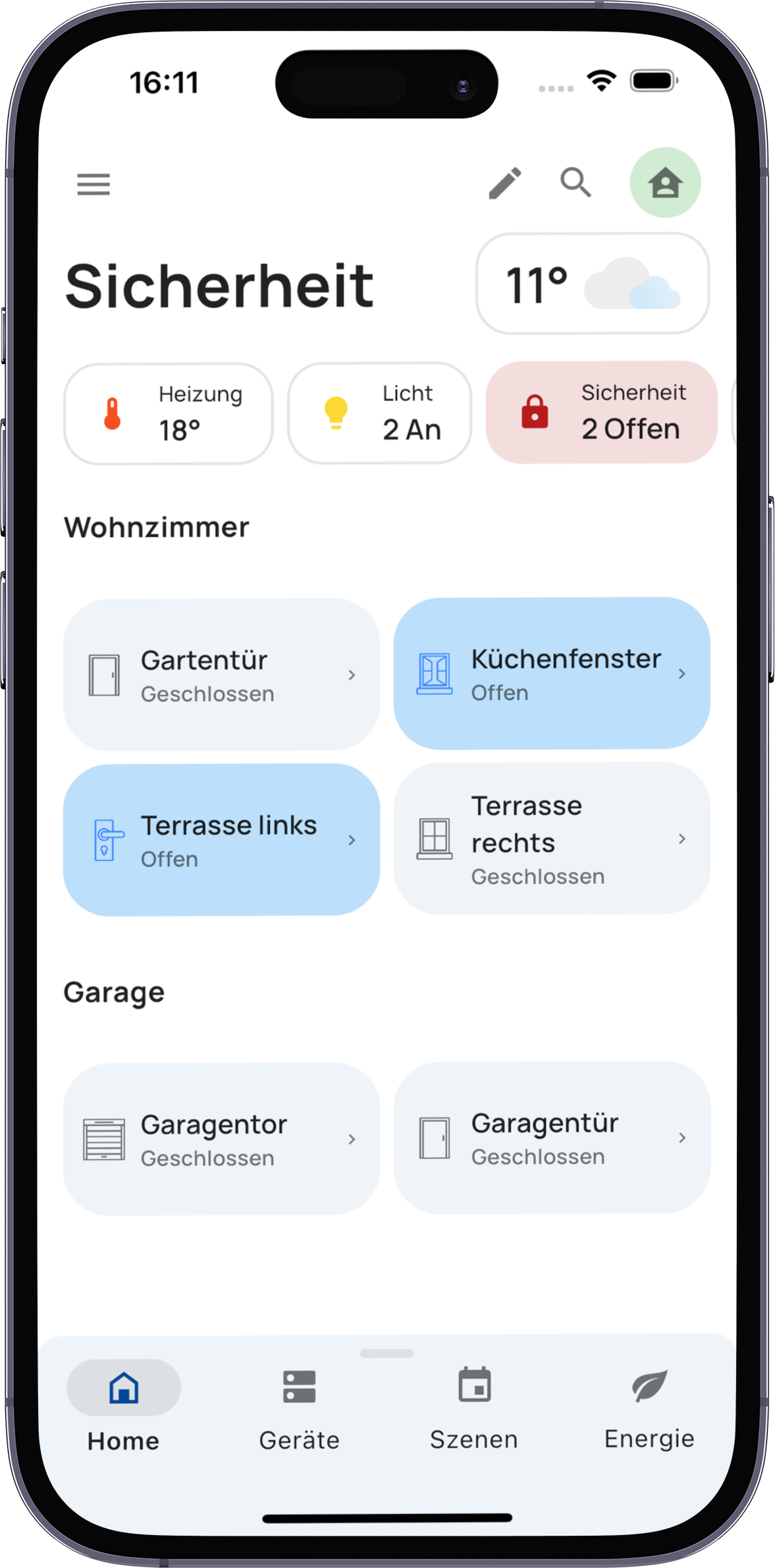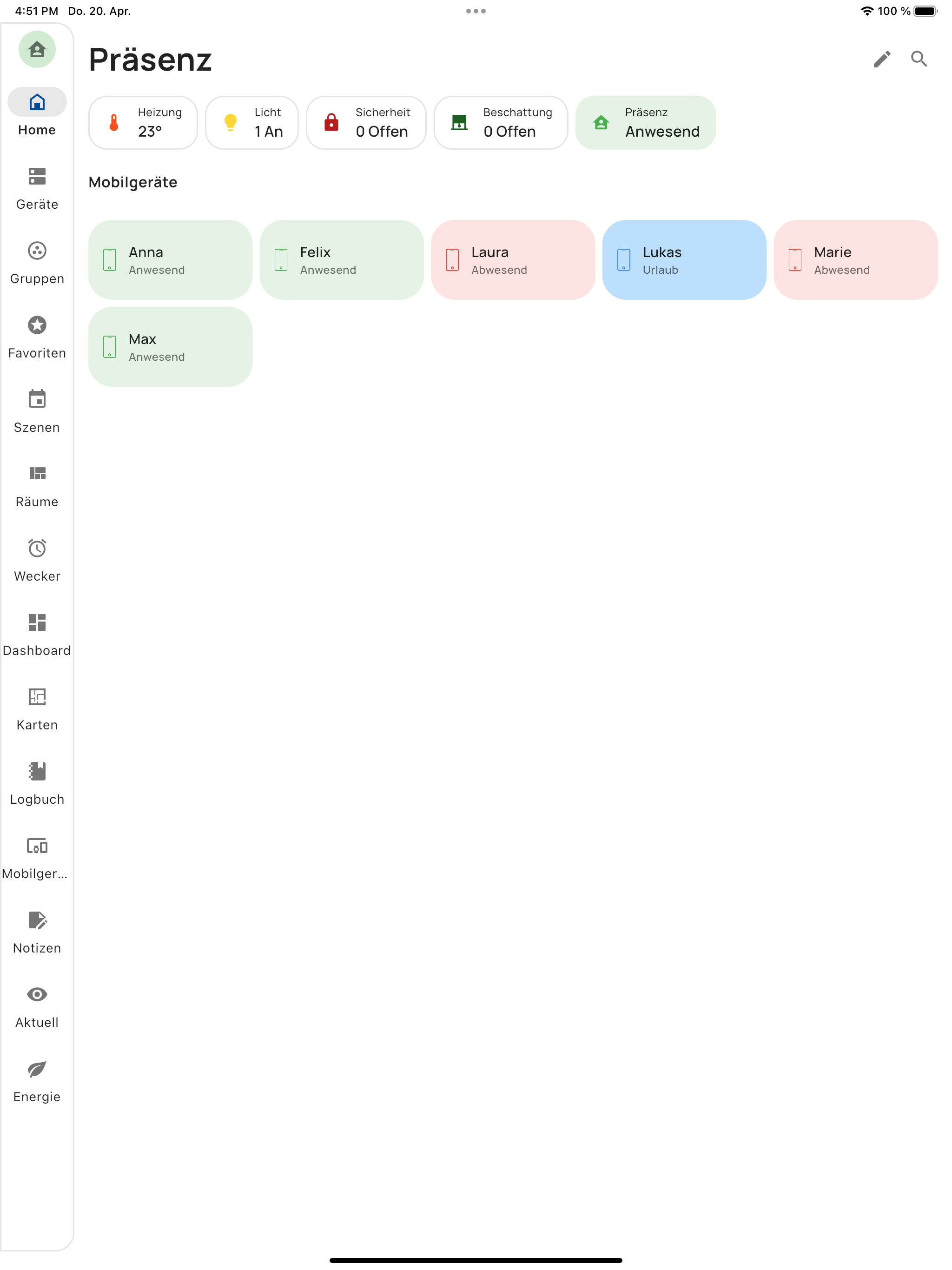 Smartphone Smartphone Smartphone, Tablet, Laptop Tablet, iMac Tablet, Monitor Smartphone, Tablet, Watch Tablet Tablet Tablet Tablet Tablet Tablet Lichtsteuerung Rollladen, Jalousien, Raffstores, Textilscreens und Markisen Heizungssteuerung Sicherheit Anwesenheitserkennung Lichtsteuerung Rollladen, Jalousien, Raffstores, Textilscreens und Markisen Heizungssteuerung Sicherheit AnwesenheitserkennungInformationen zu den einzelnen Funktionsbereichen